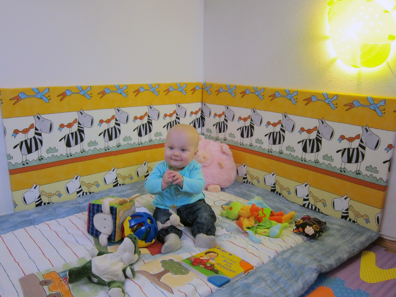 Flora hat zu Weihnachten ganz viele tolle Spielsachen geschenkt bekommen und die wollen auch ordentlich bespielt werden. Das geht natürlich am Besten in einer Spiele-Ecke. Und so haben wir zuerst den Baumarkt und DEN einschlägigen Stoffladen in Wilten leer gekauft und anschließend beherzt den Handwerksgürtel umgeschlungen. Mit doppelseitigem Klebeband, Tucker und reichlich Augenmaß ausgerüstet, machten wir uns an die Arbeit und nach einer guten Stunde konnten wir das Mädchen ins fertige Eck setzen. Damit sie nicht im Dunkeln sitzen muss, werden sowohl das Blumenmädchen als auch ihre Spielsachen von einem grünen, leuchtenden Käfer ins rechte Licht gerückt.