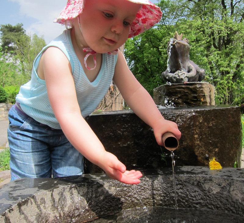 Den Feiertag und das angenehme Wetter haben wir ausgenutzt und sind mit Emilia und ihren Eltern im Botanischen Garten spazieren gegangen. Bewaffnet mit Kaffee und selbstgemachtem Karottenkuchen (der hat ausgezeichnet geschmeckt, vielen Dank an die Backmeisterin) und ein paar Utensilien aus unserem Picknickrucksack haben wir im überdachten Pavillon unsere Basisstation errichtet. Von dort lässt es sich nämlich hervorragend über die Wiese laufen und der Froschkönigbrunnen ist auch nicht weit entfernt. Drei Mal dürft ihr raten, wie weit wir im Garten gekommen sind…. Dabei gäbe es so viel zu entdecken!