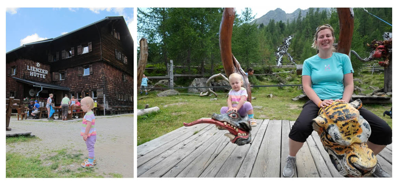 Die Hälfte unserer ersten gemeinsamen Urlaubswoche im August verbrachten wir in Lienz. Weil das Wetter so wunderbar war und es in Lienz und Umgebung wundervolle Wanderstrecken zu erkunden gibt, haben wir uns in die Wanderpatschen geworfen und sind losmarschiert. Gemeinsam mit Opa Walter, Oma Renate und unseren Wenigkeiten haben wir die Lienzer Hütte im Debanttal erwandert. Nach gemütlichen 90 Minuten (am Bequemsten wanderte übrigens Flora in ihrer Kraxe) erreichten wir die Hütte. Eine ordentliche Stärkung später hat Flora den tollen Spielplatz erkundet und wollte sich gar nicht mehr vor der tollen Wasserrutsche verabschieden.